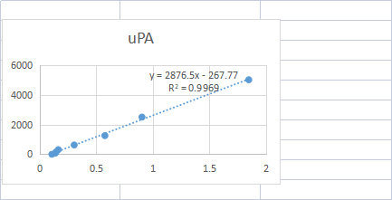 To assess the linearity of the assay, samples were spiked with high concentrations of human uPA in various matrices and diluted with the Sample Diluent to produce samples with values within the dynamic range of the assay.