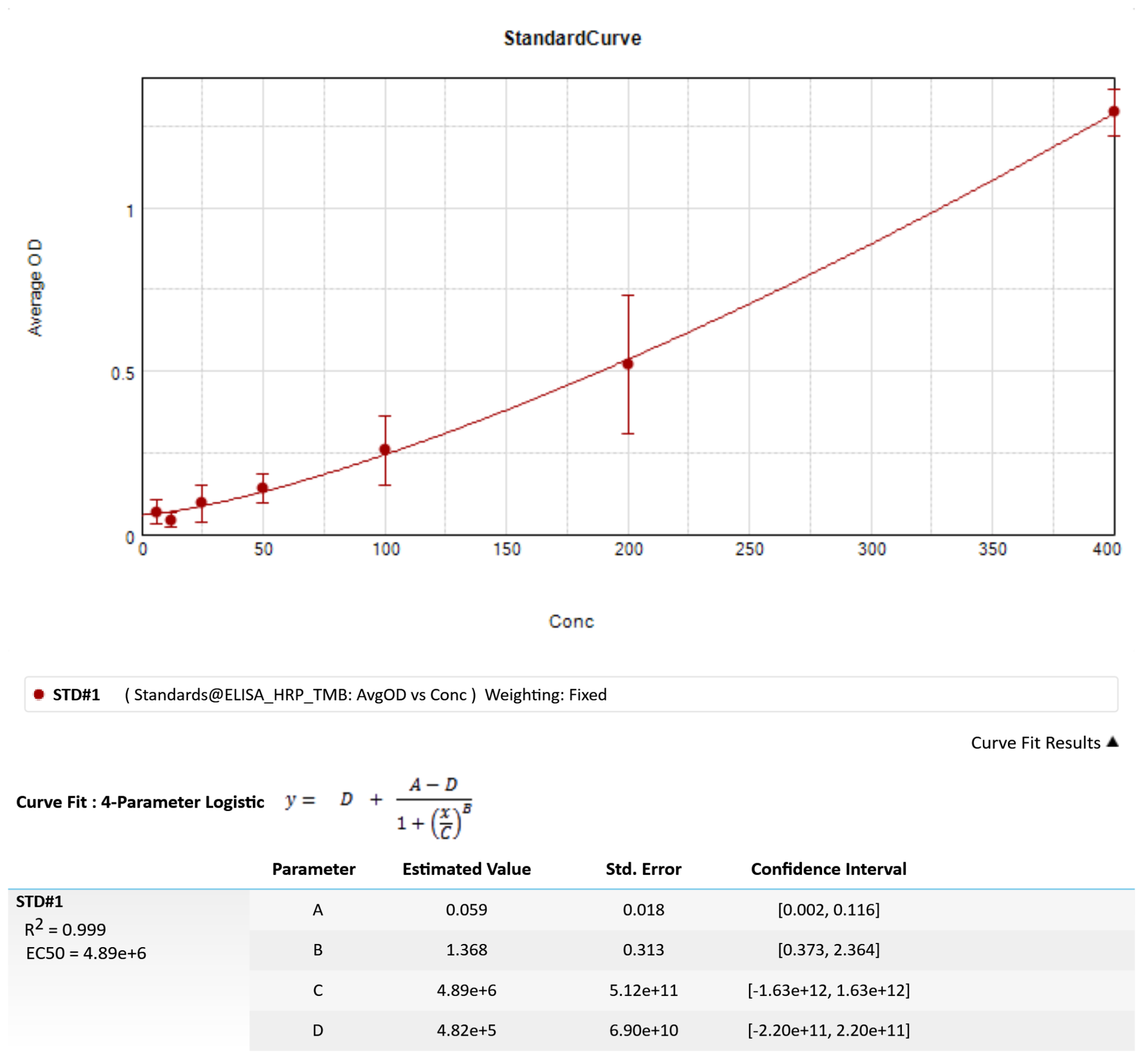 pg/ml OD1 OD2 Average Corrected 400 2.192 2.333 2.263 2.096 200 1.485 1.398 1.442 1.275 100 0.825 0.830 0.828 0.661 50 0.593 0.611 0.602 0.435 25 0.351 0.381 0.366 0.199 12.5 0.271 0.280 0.276 0.109 6.25 0.223 0.219 0.221 0.054 0 0.165 0.168 0.167 -