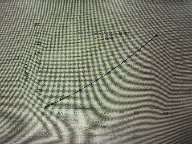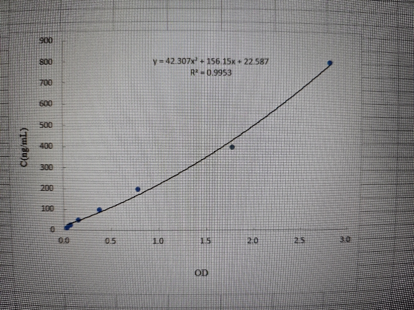 ng/ml OD1 OD2 Average Corrected 800 2.801 2.869 2.835 2.748 400 2.484 2.398 2.441 2.354 200 1.716 1.768 1.742 1.655 100 0.944 0.968 0.956 0.869 50 0.454 0.468 0.461 0.374 25 0.256 0.248 0.252 0.165 12.5 0.147 0.151 0.149 0.062 0 0.085 0.089 0.087 -