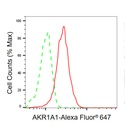 • Flow cytometric analysis of AKR1A1 expression in HepG2 cells using AKR1A1 antibody. Green, isotype control; red, AKR1A1.