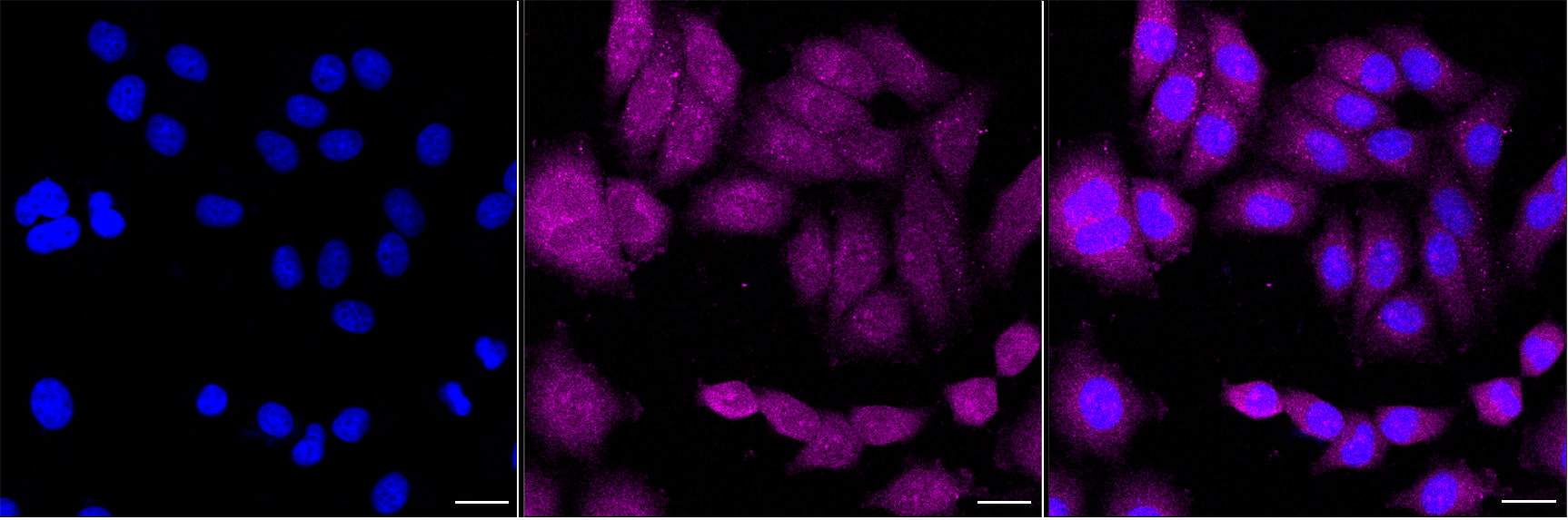 • Immunocytochemical staining of HepG2 cells with AKR1A1 antibody. Nuclei were stained blue with DAPI; AKR1A1 was stained magenta with Alexa Fluor? 647. Images were taken using Leica stellaris 5. Protein abundance based on laser Intensity and Smart Gain: Medium. Scale bar, 20 μm.