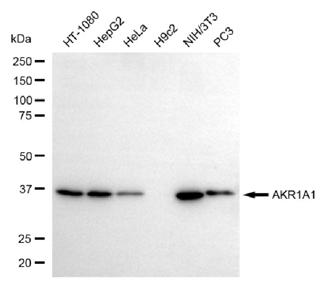 • Western blotting analysis using AKR1A1 antibody. Total cell lysates (30 μg) from various cell lines were loaded and separated by SDS-PAGE. The blot was incubated with AKR1A1 antibody and HRP-conjugated goat anti-mouse secondary antibody respectively.