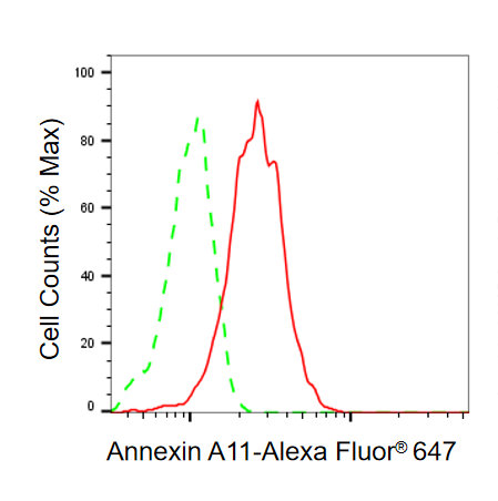 • Flow cytometric analysis of Annexin A11 expression in HepG2 cells using Annexin A11 antibody. Green, isotype control; red, Annexin A11.