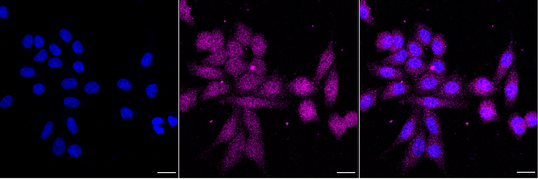 • Immunocytochemical staining of HepG2 cells with Annexin A11 antibody. Nuclei were stained blue with DAPI; Annexin A11 was stained magenta with Alexa Fluor? 647. Images were taken using Leica stellaris 5. Protein abundance based on laser Intensity and Smart Gain: Low. Scale bar, 20 μm.
