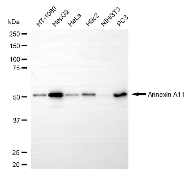 • Western blotting analysis using annexin A11 antibody. Total cell lysates (30 μg) from various cell lines were loaded and separated by SDS-PAGE. The blot was incubated with annexin A11 antibody and HRP-conjugated goat anti-mouse secondary antibody respectively.