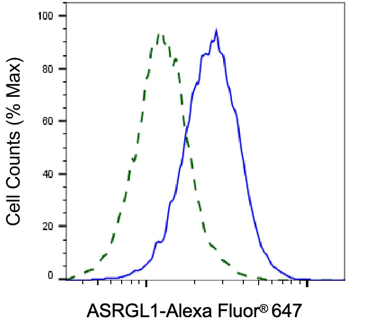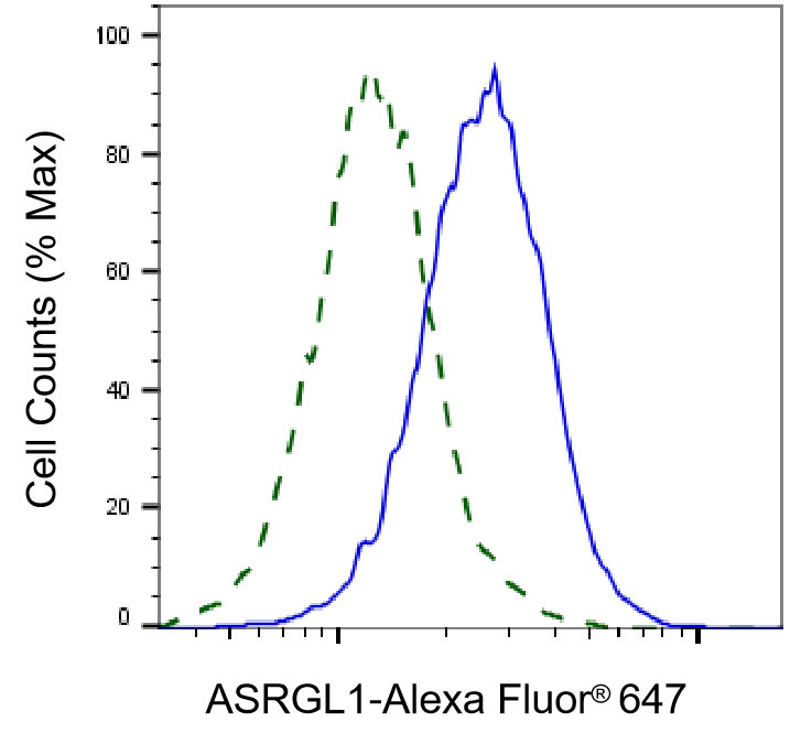 Validation of ASRGL1 knockdown using flow cytometry. Wild-type(WT, Blue) and knockdown(KD, Green) HeLa cells were stained with ASRGL1 antibody and analyzed using BD flow cytometer.