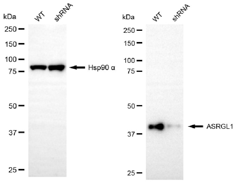Western blotting analysis using ASRGL1 antibody. ASRGL1 expression in wild-type (WT) and ASRGL1 shRNA knockdown (KD) HeLa cells with 20μg of total cell lysates. Hsp90 α serves as a loading control. The blot was incubated with ASRGL1 antibody and HRP-conjugated goat anti-mouse secondary antibody respectively.