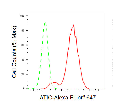 Flow cytometric analysis of ATIC expression in C2C12 cells using ATIC antibody. Green, isotype control; red, ATIC.