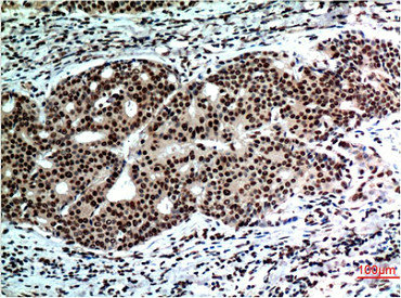 • Immunohistochemical analysis of paraffin-embedded Human Breast Carcinoma Tissue using Beclin-1 Mouse mAb diluted at 1:200.
