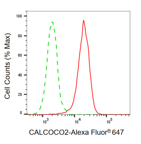 • Flow cytometric analysis of CALCOCO2 expression in HeLa cells using CALCOCO2 antibody. Green, isotype control; red, CALCOCO2.