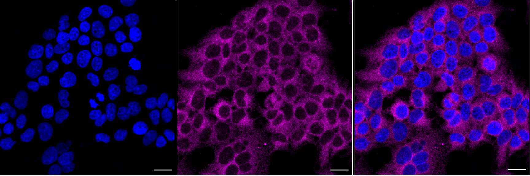 • Immunocytochemical staining of HeLa cells with CALCOCO2 antibody. Nuclei were stained blue with DAPI; CALCOCO2 was stained magenta with Alexa Fluor? 647. Images were taken using Leica stellaris 5. Protein abundance based on laser Intensity and Smart Gain:Medium. Scale bar, 20 μm.
