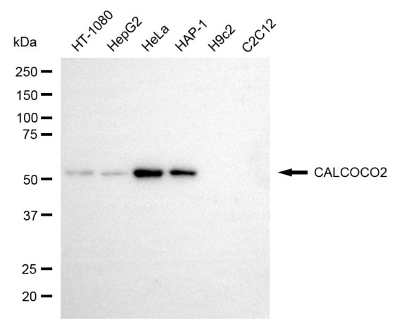 • Western blotting analysis using CALCOCO2 antibody. Total cell lysates (30 μg) from various cell lines were loaded and separated by SDS-PAGE. The blot was incubated with CALCOCO2 antibody and HRP-conjugated goat anti-mouse secondary antibody respectively.
