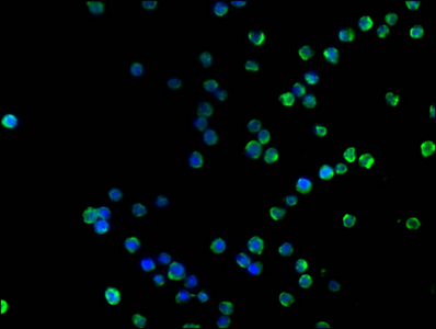 • Immunofluorescence staining of Raji cells with CSB-MA004888A0m at 1:100, counter-stained with DAPI. The cells were blocked in 10% normal Goat Serum and then incubated with the primary antibody overnight at 4°C. The secondary antibody was Alexa Fluor 488-congugated AffiniPure Goat Anti-Mouse IgG(H+L).