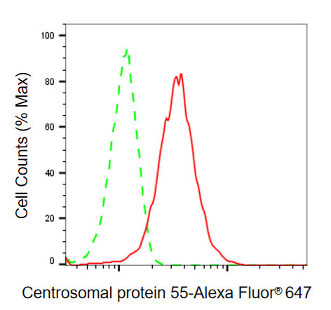 Flow cytometric analysis of Centrosomal protein 55 expression in HeLa cells using Centrosomal protein 55 antibody. Green, isotype control; red, Centrosomal protein 55.