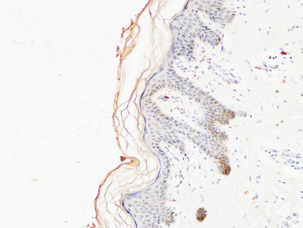 Immunohistochemical analysis of paraffin-embedded Human skin. COL1A1 Antibody was diluted at 1:200.