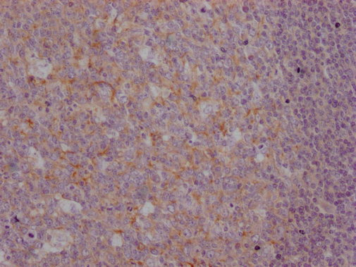 • IHC image of CSB-MA916751 diluted at 1:100 and staining in paraffin-embedded human tonsil tissue performed on a Leica BondTM system. After dewaxing and hydration, antigen retrieval was mediated by high pressure in a citrate buffer (pH 6.0). Section was blocked with 10% normal goat serum 30min at RT. Then primary antibody (1% BSA) was incubated at 4°C overnight. The primary is detected by a Goat anti-mouse IgG polymer labeled by HRP and visualized using 0.05% DAB.