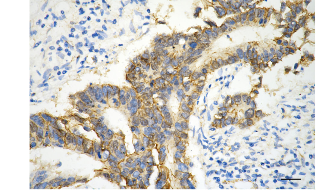 Immunohistochemistry was performed on paraffin-embedded human sigmoid colon carcinoma using catenin beta 1 antibody. Antigen retrieval was done in sodium citrate buffer (pH 6.0). DAB was used for detection, with hematoxylin counterstaining. Images were acquired using a Nikon Ci-L Plus microscope (40× objective). Scale bar: 25 μm.