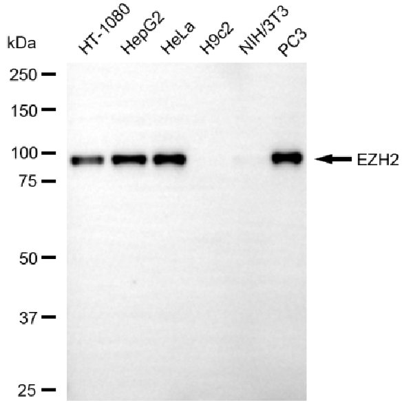 Western blotting analysis using EZH2 antibody. Total cell lysates (30 μg) from various cell lines were loaded and separated by SDS-PAGE. The blot was incubated with EZH2 antibody and HRP-conjugated goat anti-mouse secondary antibody respectively.