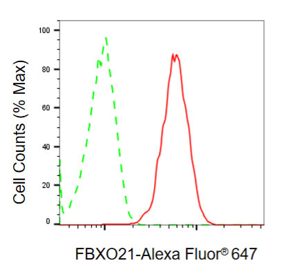 Flow cytometric analysis of FBXO21 expression in HAP-1 cells using FBXO21 antibody. Green, isotype control; red, FBXO21.