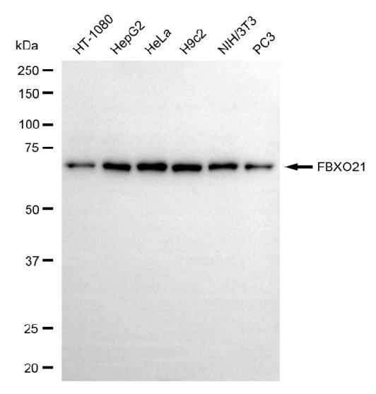 Western blotting analysis using FBXO21 antibody. Total cell lysates (30 μg) from various cell lines were loaded and separated by SDS-PAGE. The blot was incubated with FBXO21 antibody and HRP-conjugated goat mouse secondary antibody respectively.