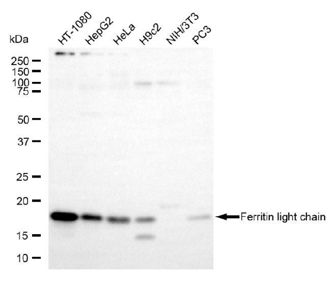 • Western blotting analysis using ferritin light chain antibody. Total cell lysates (30 μg) from various cell lines were loaded and separated by SDS-PAGE. The blot was incubated with ferritin light chain antibody and HRP-conjugated goat anti-mouse secondary antibody respectively.
