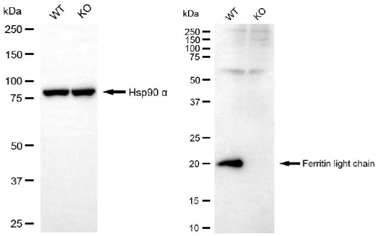 • Western blotting analysis using ferritin light chain antibody. Ferritin light chain expression in wild type (WT) and ferritin light chain (FTL) knockout (KO) HSHC cells with 40 μg of total cell lysates. Hsp90 α serves as a loading control. The blot was incubated with ferritin light chain antibody and HRP-conjugated goat anti-mouse secondary antibody respectively.