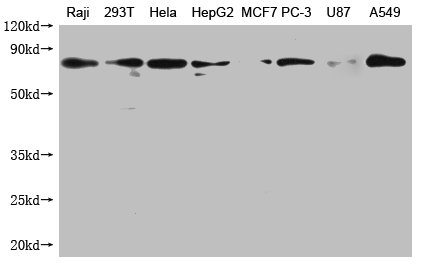 Positive WB detected in: Raji whole cell lysate, 293T whole cell lysate, Hela whole cell lysate, HepG2 whole cell lysate, MCF-7 whole cell lysate, PC-3 whole cell lysate, U87 whole cell lysate, A549 whole cell lysate