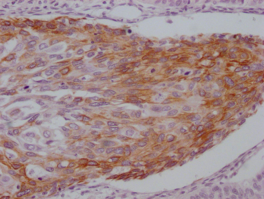 • IHC image of CSB-MA785224 diluted at 1:100 and staining in paraffin-embedded human cervical cancer performed on a Leica BondTM system. After dewaxing and hydration, antigen retrieval was mediated by high pressure in a citrate buffer (pH 6.0). Section was blocked with 10% normal goat serum 30min at RT. Then primary antibody (1% BSA) was incubated at 4°C overnight. The primary is detected by a Goat anti-mouse IgG polymer labeled by HRP and visualized using 0.05% DAB.
