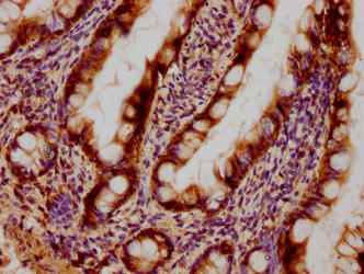 Immunohistochemical of paraffin-embedded human small intestinal tissue using CSB-MA0128871A0m at dilution of 1:100