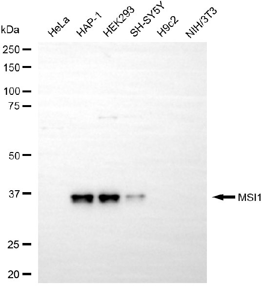 • Western blotting analysis using MSI1 antibody. Total cell lysates (30 μg) from various cell lines were loaded and separated by SDS-PAGE. The blot was incubated with MSI1 antibody and HRP-conjugated goat mouse secondary antibody respectively.