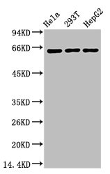 • Western blot analysis of 1) Hela, 2) 293T, 3) HepG, diluted at 1:2000.
