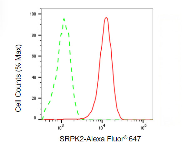 • Flow cytometric analysis of SRPK2 expression in HepG2 cells using SRPK2 antibody. Green, isotype control; red, SRPK2.