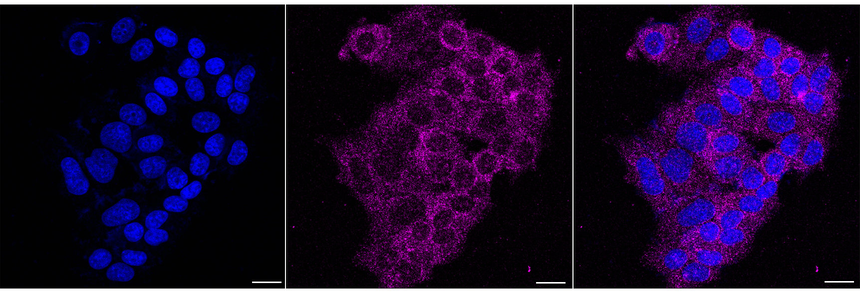 • Immunocytochemical staining of HepG2 cells with SRPK2 antibody. Nuclei were stained blue with DAPI; SRPK2 was stained magenta with Alexa Fluor? 647. Images were taken using Leica stellaris 5. Protein abundance based on laser Intensity and smart gain:Low. Scale bar, 20 μm.