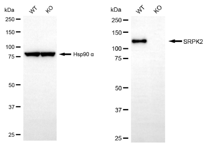 • Western blotting analysis using SRPK2 antibody. SRPK2 expression in wild type (WT) and SRPK2 knockout (KO) HeLa cells with 30 μg of total cell lysates. Hsp90 α serves as a loading control. The blot was incubated with SRPK2 antibody and HRP-conjugated goat anti-mouse secondary antibody respectively.