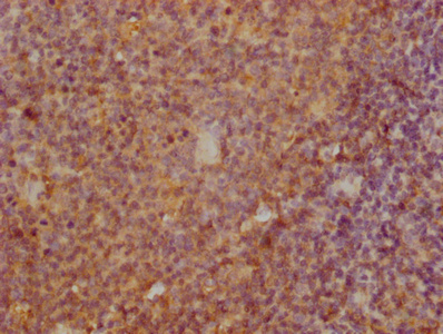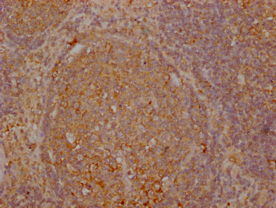 IHC image of CSB-MA023974A0m diluted at 1:100 and staining in paraffin-embedded human lymph node tissue performed on a Leica BondTM system. After dewaxing and hydration, antigen retrieval was mediated by high pressure in a citrate buffer (pH 6.0). Section was blocked with 10% normal goat serum 30min at 37°C Then primary antibody (1% BSA) was incubated at 4°C overnight. The primary is detected by a Goat anti-Mouse IgG labeled by HRP and visualized using 0.05% DAB.