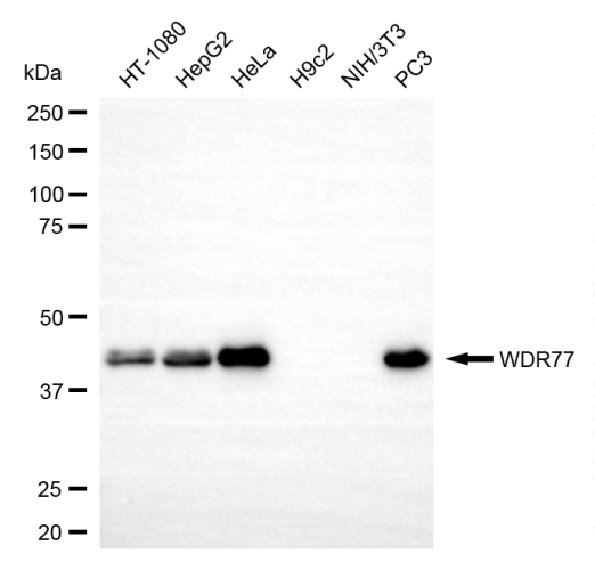 Western blotting analysis using WDR77 antibody. Total cell lysates (30 μg) from various cell lines were loaded and separated by SDS-PAGE. The blot was incubated with WDR77 antibody and HRP-conjugated goat anti-mouse secondary antibody respectively.