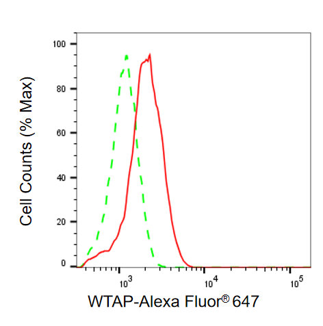 Flow cytometric analysis of WTAP expression in HeLa cells using WTAP antibody. Green, isotype control; red, WTAP.