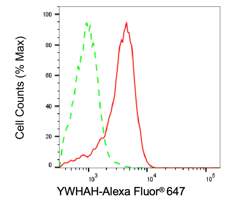 • Flow cytometric analysis of YWHAH expression in HAP-1 cells using YWHAH antibody. Green, isotype control; red, YWHAH.