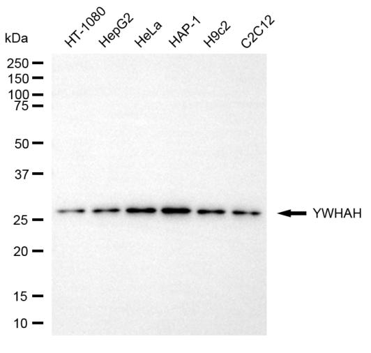• Western blotting analysis using YWHAH antibody. Total cell lysates (30 μg) from various cell lines were loaded and separated by SDS-PAGE. The blot was incubated with YWHAH antibody and HRP-conjugated goat anti-mouse secondary antibody respectively.