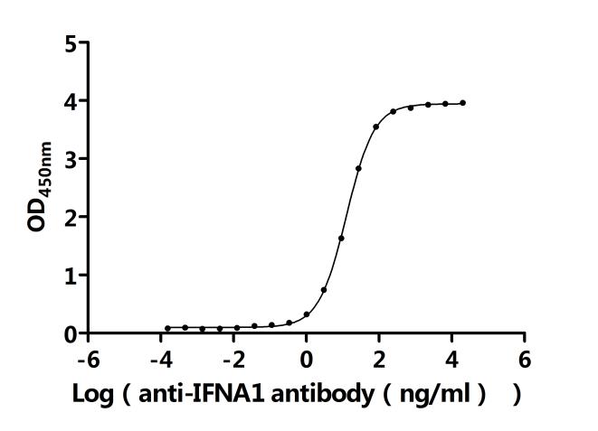 Measured by its binding ability in a functional ELISA.Immobilized Human IFNA1 at 2 μg/mL can bind Anti-IFNA1 recombinant antibody(CSB-RA365592MA1HU). The EC50 is 12.11-13.37 ng/mL.