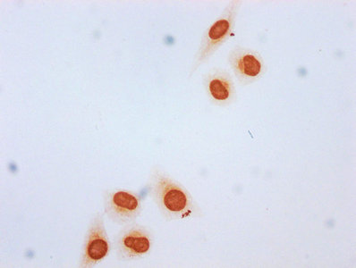 Immunocytochemistry analysis of CSB-PA010418OA04bhbHU diluted at 1:20 and staining in Hela cells (treated with 50mM sodium 3-hydroxybutyrate for 72h) performed on a Leica BondTM system. The cells were fixed in 4% formaldehyde, permeabilized using 0.2% Triton X-100 and blocked with 10% normal goat serum 30min at RT. Then primary antibody (1% BSA) was incubated at 4°C overnight. The primary is detected by a biotinylated secondary antibody and visualized using an HRP conjugated SP system.