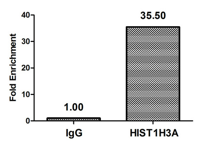 Chromatin Immunoprecipitation Hela (4*106, treated with 30mM sodium 3-hydroxybutyrate for 4h) were treated with Micrococcal Nuclease, sonicated, and immunoprecipitated with 5µg anti-HIST1H3A (CSB-PA010418OA04bhbHU) or a control normal rabbit IgG. The resulting ChIP DNA was quantified using real-time PCR with primers against the β-Globin promoter.