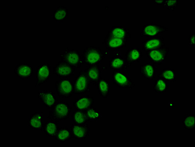 Immunofluorescence staining of Hela cells (treated with 30mM sodium butyrate for 4h) with CSB-PA010403OA12hibHU at 1:7.5, counter-stained with DAPI. The cells were fixed in 4% formaldehyde, permeabilized using 0.2% Triton X-100 and blocked in 10% normal Goat Serum. The cells were then incubated with the antibody overnight at 4°C. The secondary antibody was Alexa Fluor 488-congugated AffiniPure Goat Anti-Rabbit IgG(H+L).