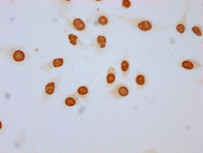 Immunocytochemistry analysis of CSB-PA010418OA18hibHU diluted at 1:100 and staining in Hela cells (treated with 30mM sodium butyrate for 4h) performed on a Leica BondTM system. The cells were fixed in 4% formaldehyde, permeabilized using 0.2% Triton X-100 and blocked with 10% normal goat serum 30min at RT. Then primary antibody (1% BSA) was incubated at 4°C overnight. The primary is detected by a biotinylated secondary antibody and visualized using an HRP conjugated SP system.