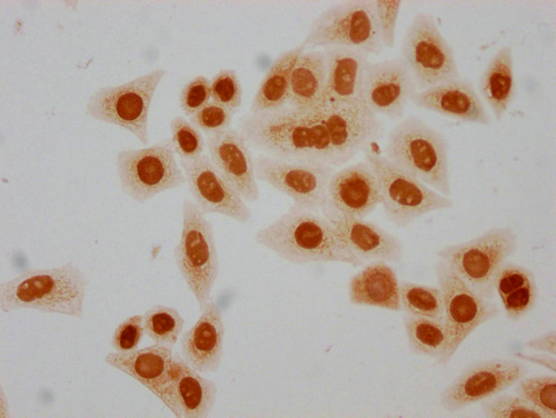 Immunocytochemistry analysis of CSB-PA010429PA05hibHU diluted at 1:50 and staining in Hela cells(treated with 30mM sodium butyrate for 4h) performed on a Leica BondTM system. The cells were fixed in 4% formaldehyde, permeabilized using 0.2% Triton X-100 and blocked with 10% normal goat serum 30min at RT. Then primary antibody (1% BSA) was incubated at 4°C overnight. The primary is detected by a biotinylated secondary antibody and visualized using an HRP conjugated SP system.