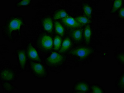 Immunofluorescence staining of A549 cells with CSB-PA774804LA01HU at 1:166, counter-stained with DAPI. The cells were fixed in 4% formaldehyde, permeabilized using 0.2% Triton X-100 and blocked in 10% normal Goat Serum. The cells were then incubated with the antibody overnight at 4°C. The secondary antibody was Alexa Fluor 488-congugated AffiniPure Goat Anti-Rabbit IgG(H+L).