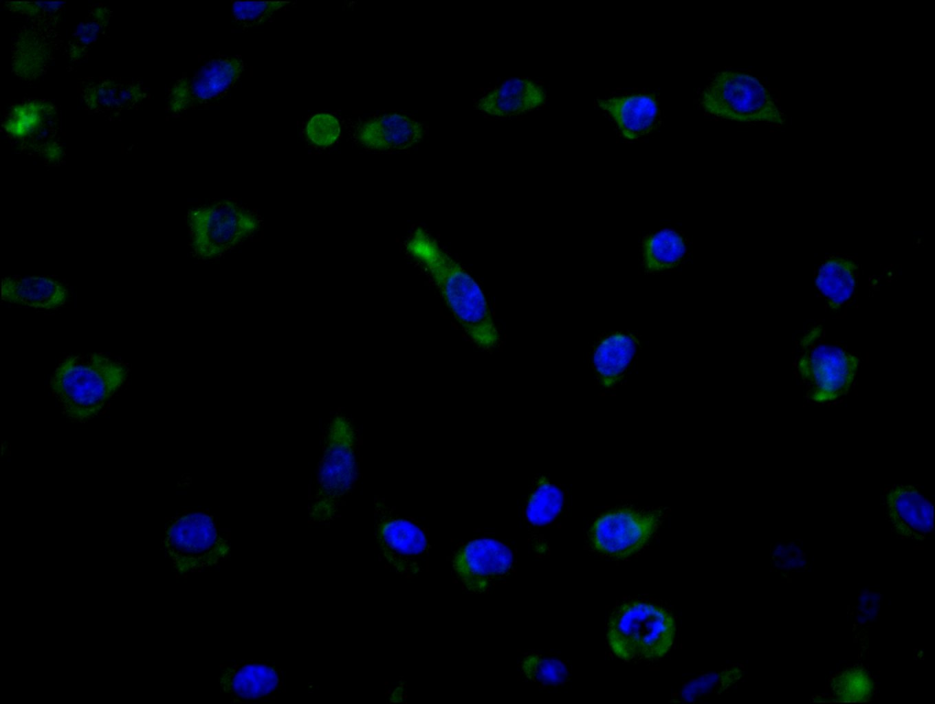 Immunofluorescence staining of MCF-7 cell with CSB-PA875651LA01HU at 1:400, counter-stained with DAPI. The cells were fixed in 4% formaldehyde and blocked in 10% normal Goat Serum. The cells were then incubated with the antibody overnight at 4C. The secondary antibody was Alexa Fluor 488-congugated AffiniPure Goat Anti-Rabbit IgG(H+L).