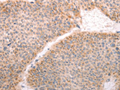 • The image on the left is immunohistochemistry of paraffin-embedded Human thyroid cancer tissue using CSB-PA187767(ABHD12 Antibody) at dilution 1/30, on the right is treated with fusion protein. (Original magnification: ×200)