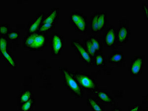 Immunofluorescent analysis of Hela cells using CSB-PA001102LA01HU at dilution of 1:100 and Alexa Fluor 488-congugated AffiniPure Goat Anti-Rabbit IgG(H+L)