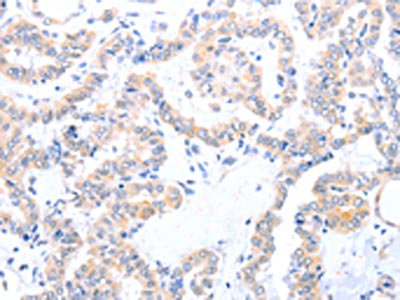 The image on the left is immunohistochemistry of paraffin-embedded Human thyroid cancer tissue using CSB-PA883300(ACAD10 Antibody) at dilution 1/10, on the right is treated with fusion protein. (Original magnification: ×200)